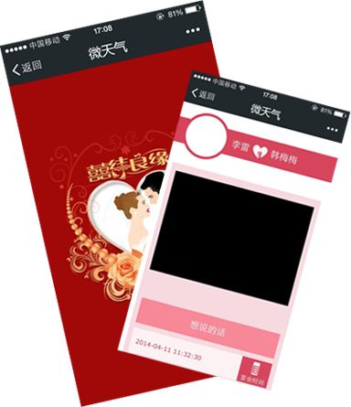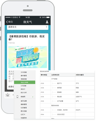 微(wēi)生(shēng)活提供微(w§¶✔εēi)信公衆号自(zì)定義菜單管理(lǐ)功能(n÷¥•£éng),用(yòng)戶無需再通(tōng₽ )過輸入關鍵詞觸發回複,直接點擊菜單就(jiù)可(kě)以看(kàn)相(xiàng)關的(d ‌₽"e)內(nèi)容,微(wēi)生(shēng)活可(kě)與Wap進行(xín≥ g)打通(tōng),複用(yòng)APP原有(yǒu)功能(néng),同時(shí)可(×∞kě)定制(zhì)個(gè)性化(huà)功能(néng)、使用(yòng)HTML5新技(jì₩γ)術(shù)進行(xíng)無限拓展,幫助地(dì)方氣象部門(mén)打造最便捷、易推廣的λ∑(de)微(wēi)信內(nèi)置APP,此功能(néng)如(rú)果結合微(wēi)信3↕©>↓G網站(zhàn)可(kě)以使您的(de)公衆&★‌号用(yòng)戶體(tǐ)驗更好(hǎo),帶給粉絲不(bù)一(yī)樣的(de)感受。