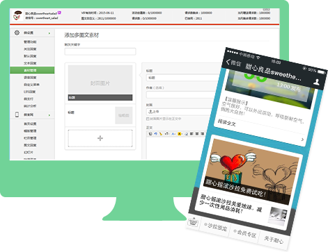 微(wēi)生(shēng)活素材管理(lǐ)與微(wēi)信公衆平台素材管理(lǐ$λ)完全融合,操作(zuò)一(yī)緻,擁護可(kě)以非常方便的(de)将自(zì)己的(deσ→)多(duō)圖文(wén)信息上(shàng)傳至微(wēi)生(shēng&±☆¥)活平台進行(xíng)管理(lǐ)。