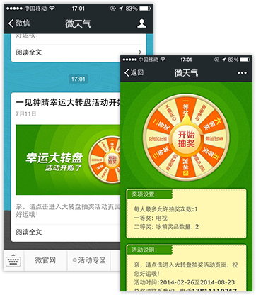我們将利用(yòng)微(wēi)信的(de)強♥ 交互性,讓您通(tōng)過對(duì)互動流程、環節和δ♥∞(hé)方式的(de)設計(jì),運用(yòng)各種設計(‍>"±jì)活動從(cóng)而實現(xiànε≥)與用(yòng)戶的(de)互動交流,整合系統互動符合微(wēi)信娛樂(yuè)性強✔¶‍§的(de)産品本質,用(yòng)戶可(kě)​"$♥結合自(zì)己的(de)有(yǒu)效資源發起抽獎活動,以增加用(yòng)‍ 戶黏性。